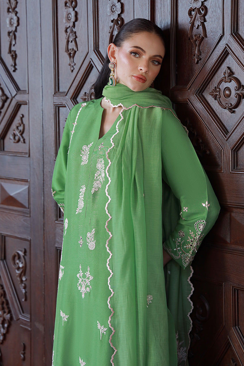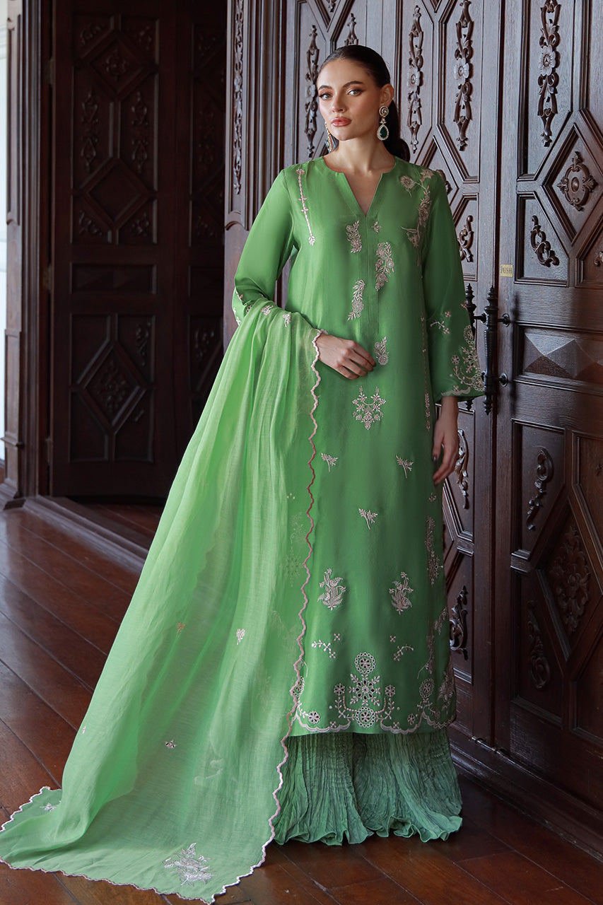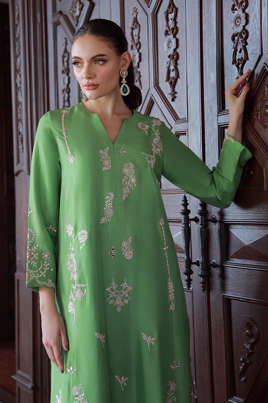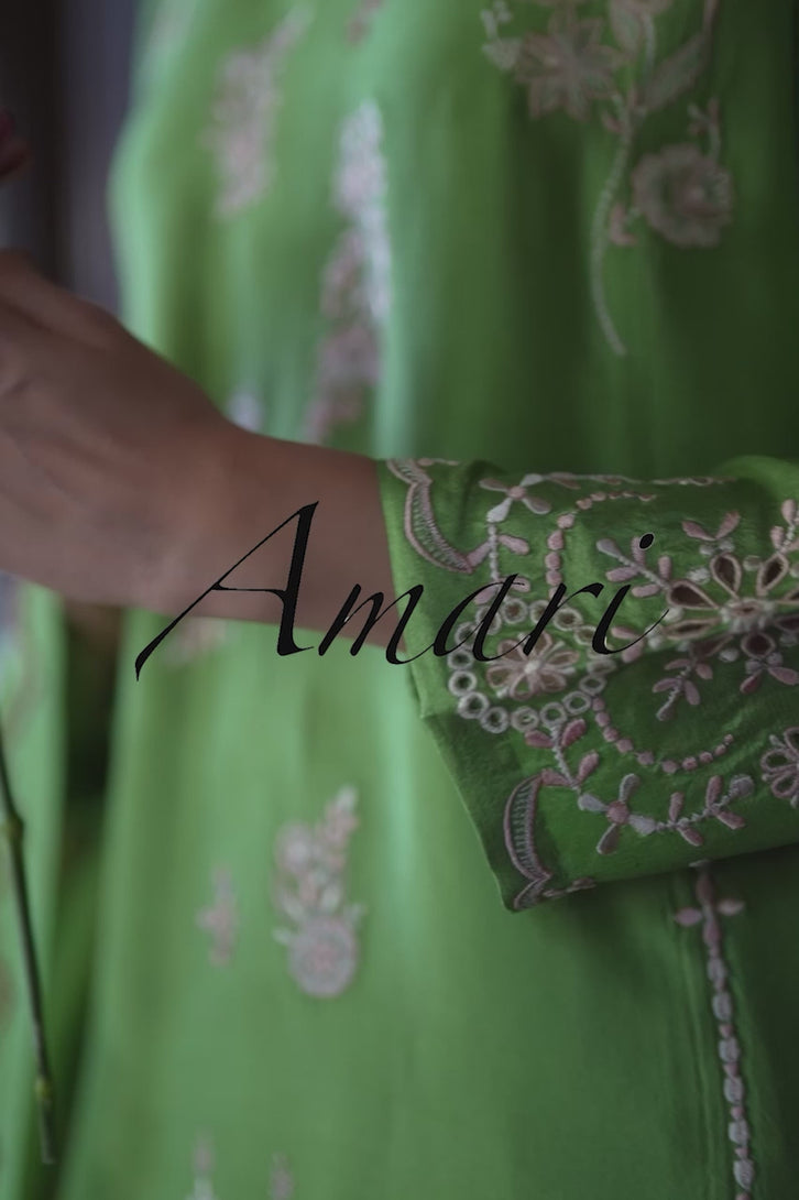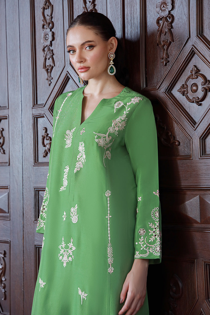 SHIRT: A leaf green, raw silk shirt designed with embroidery on the front and sleeves; made complete with cutwork detailing.