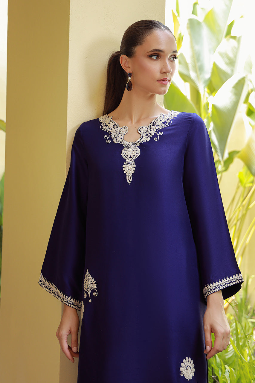 SHIRT: An indigo, raw silk shirt enhanced with embroidery on the front and sleeve cuffs.