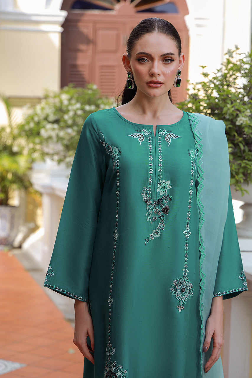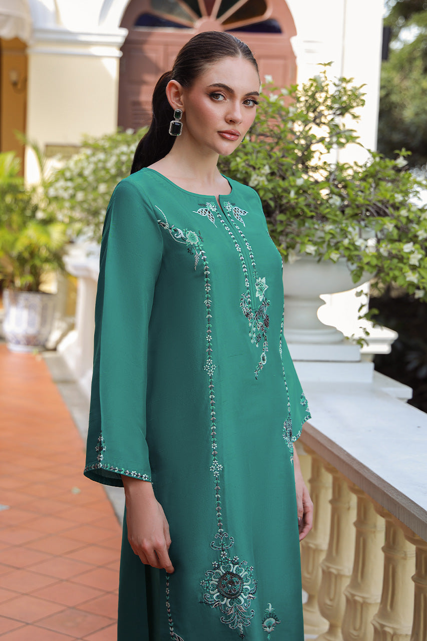 SHIRT: A jade, raw silk shirt uplifted with embroidery on the front and sleeve cuffs.
