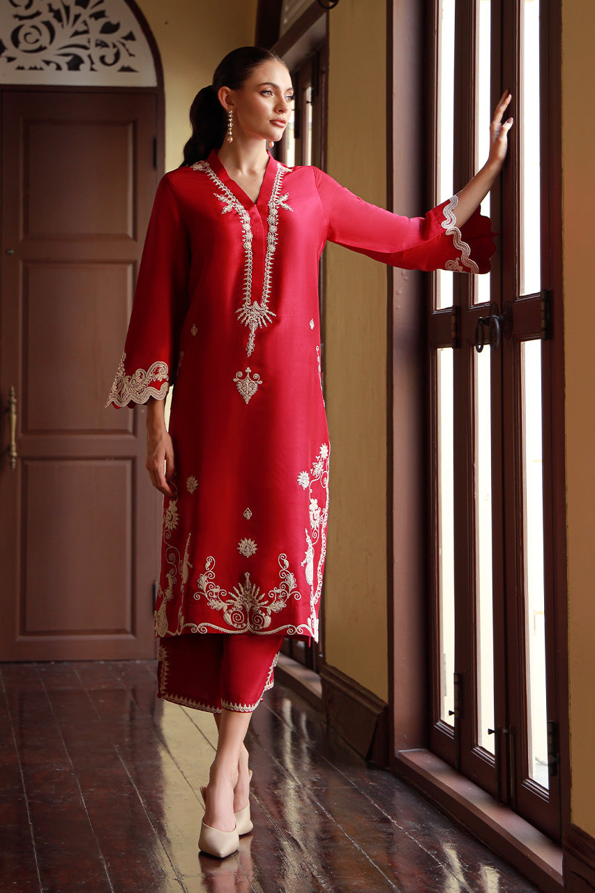 SHIRT: A raspberry, raw silk shirt accentuated with embroidery on the front and sleeve cuffs.