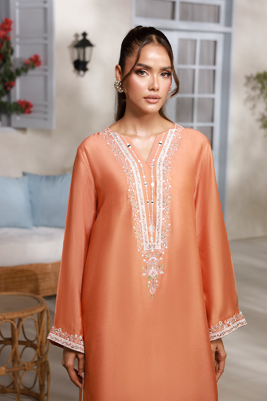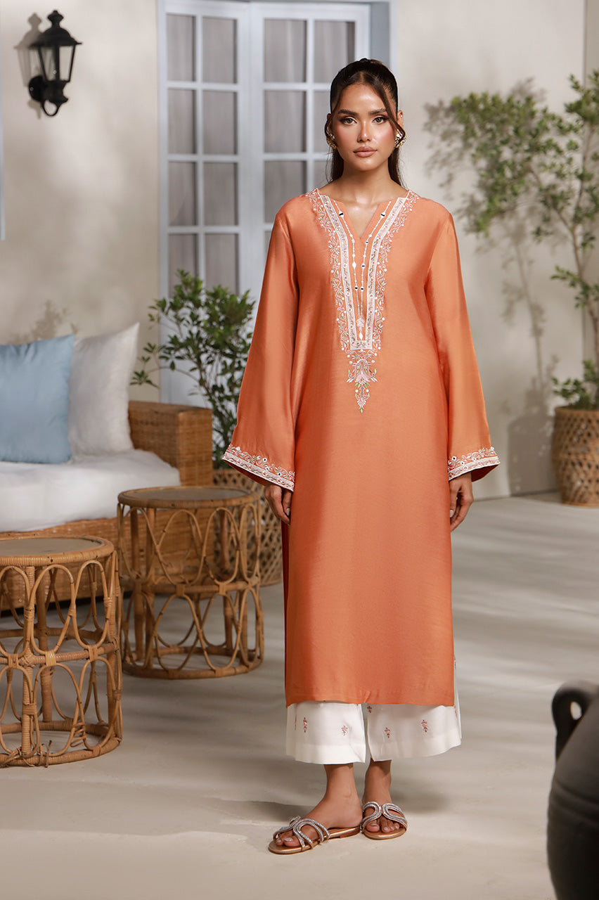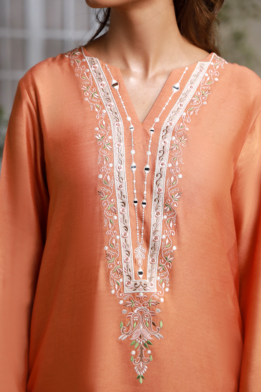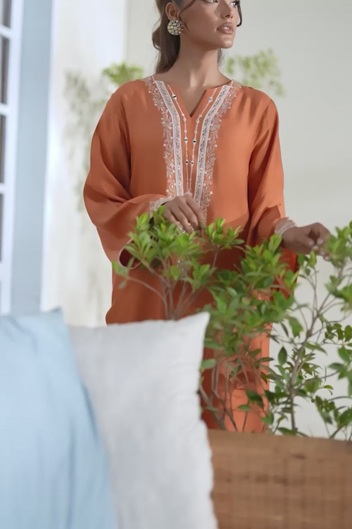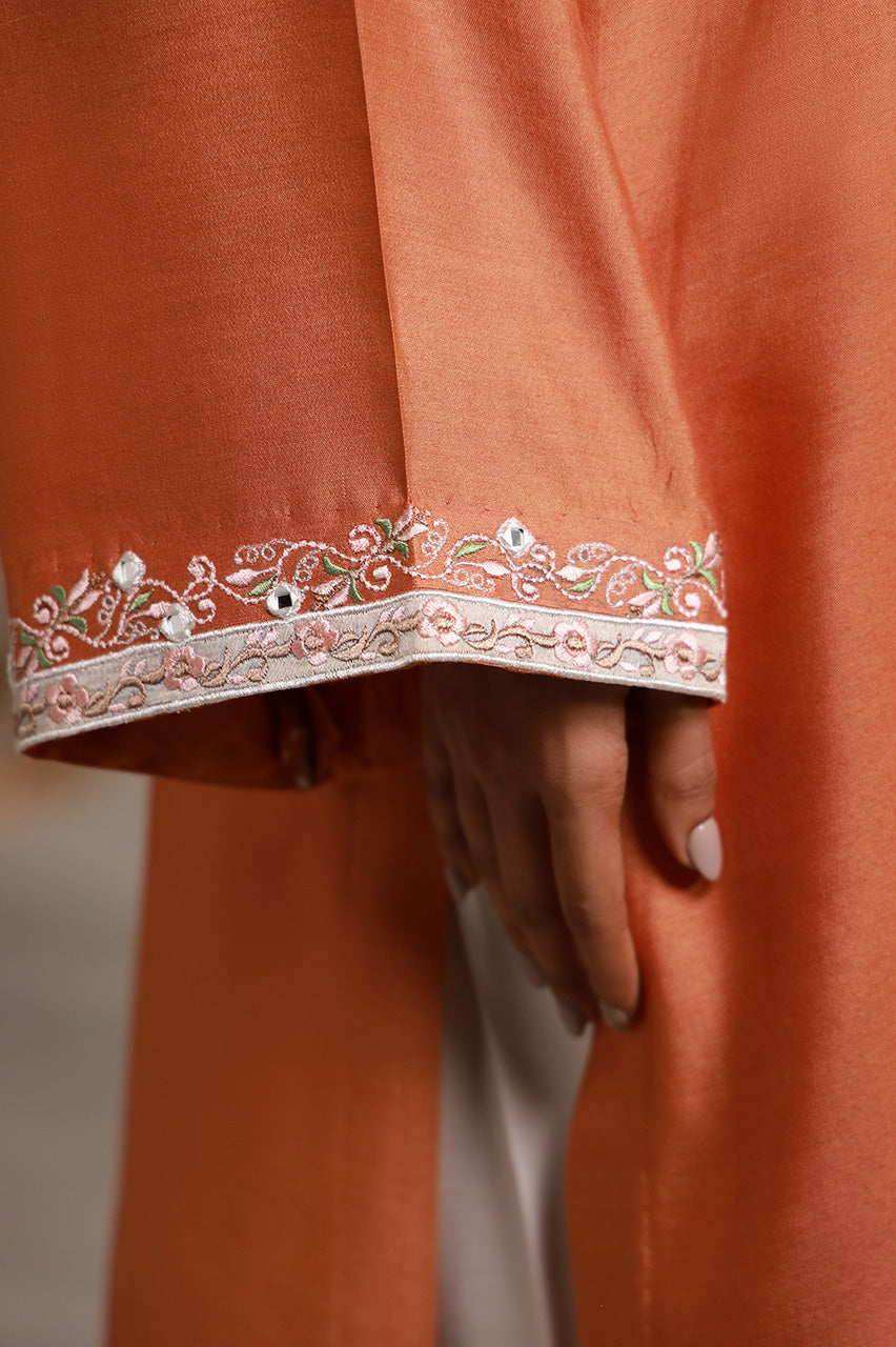 SHIRT: A rust, premium cotton shirt accentuated with embroidery on the front and sleeve cuffs; made complete with mirror work detailing.