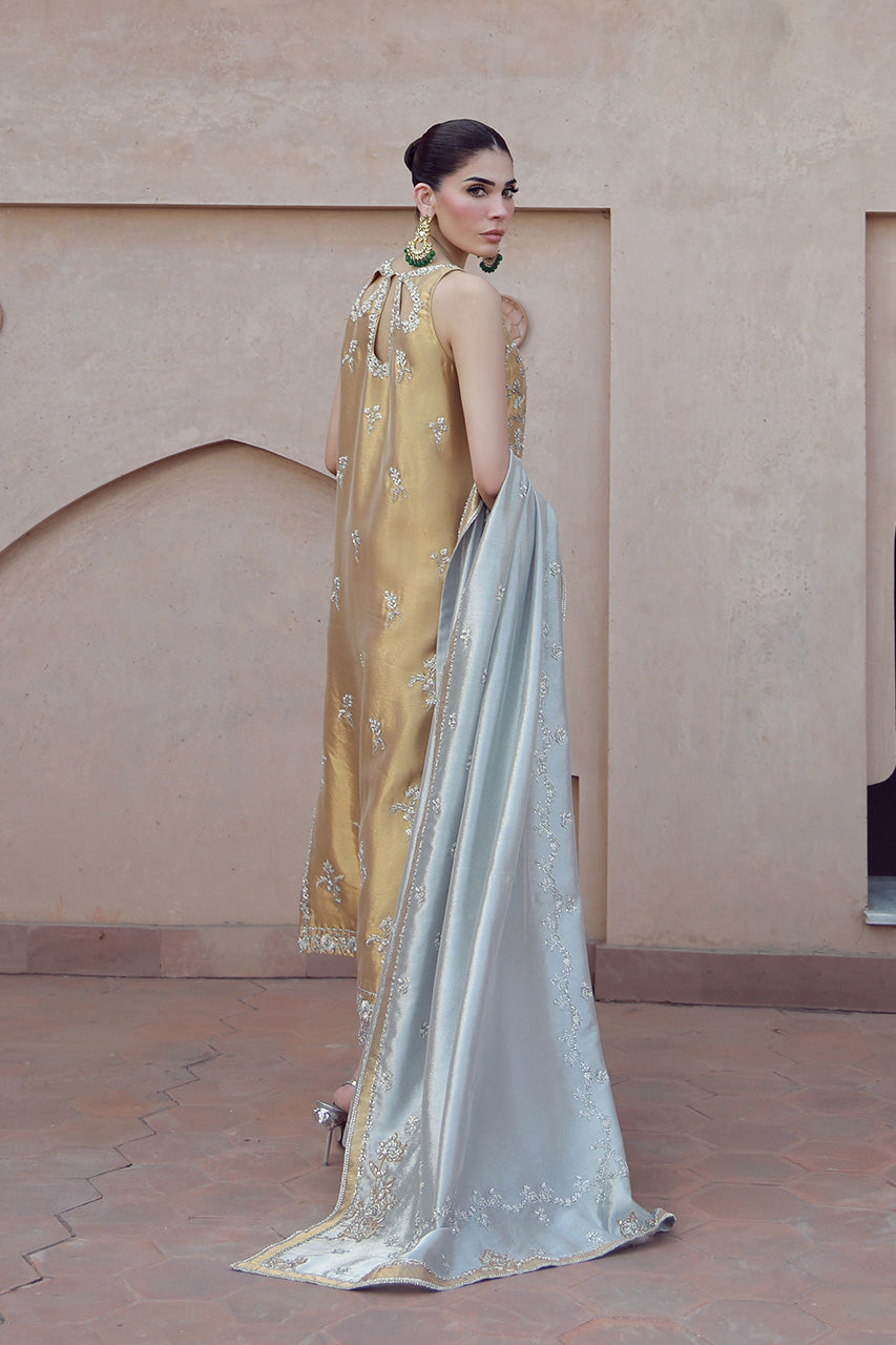 A golden, masoori shirt designed with hand embroidery on the front and back; paired with matching, banarsi silk culottes and a masoori dupatta crafted with hand embroidery.