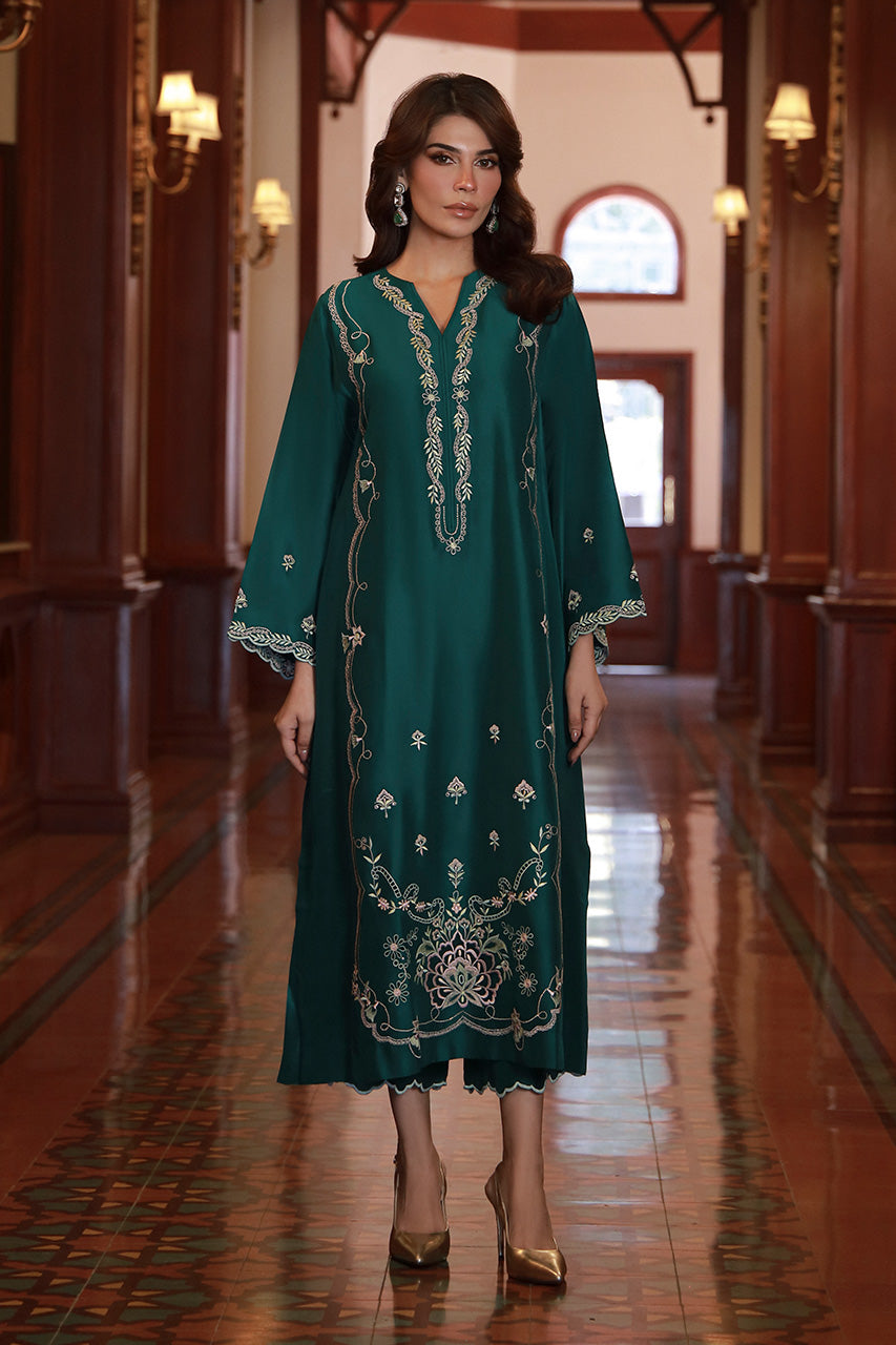 SHIRT: A sea green, raw silk shirt enhanced with embroidery on the front and sleeves.