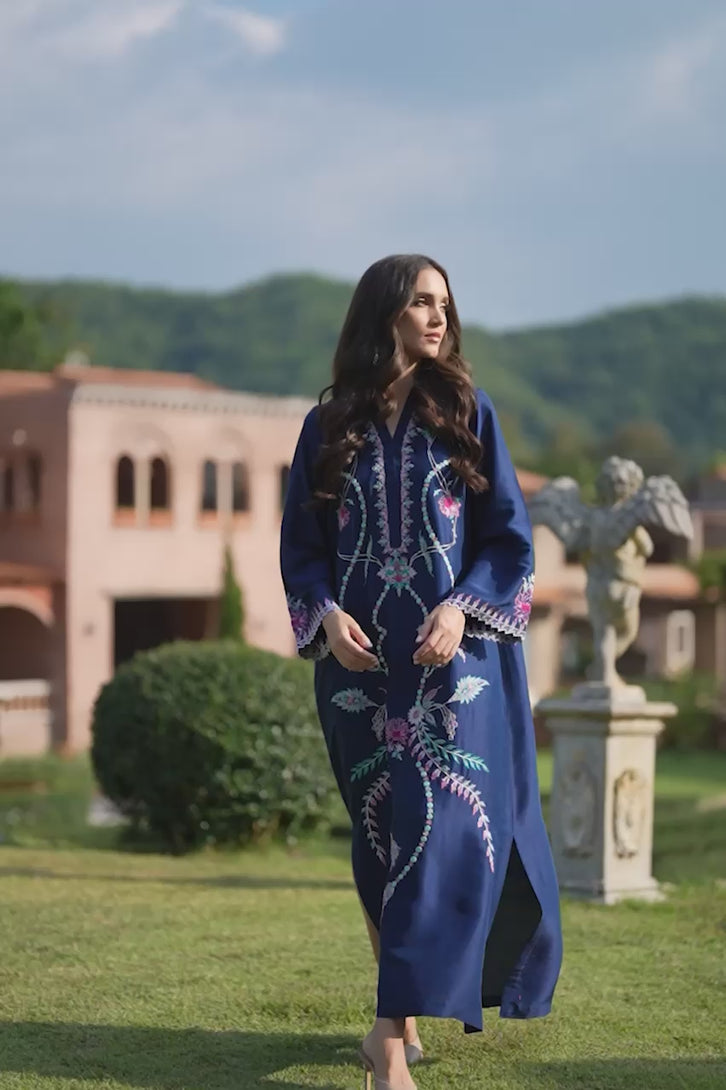 KAFTAN: A blue, raw silk kaftan accentuated with embroidery on the front and sleeves.