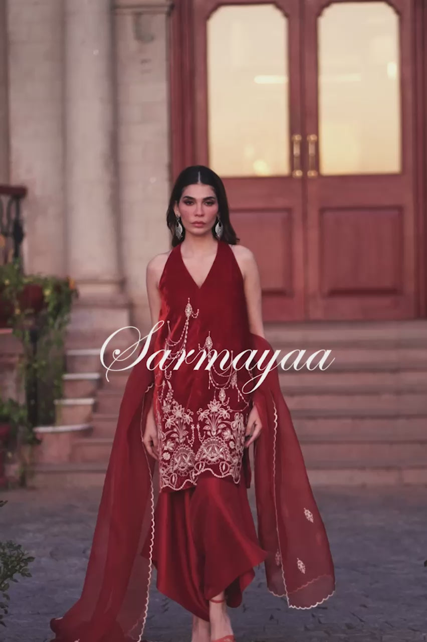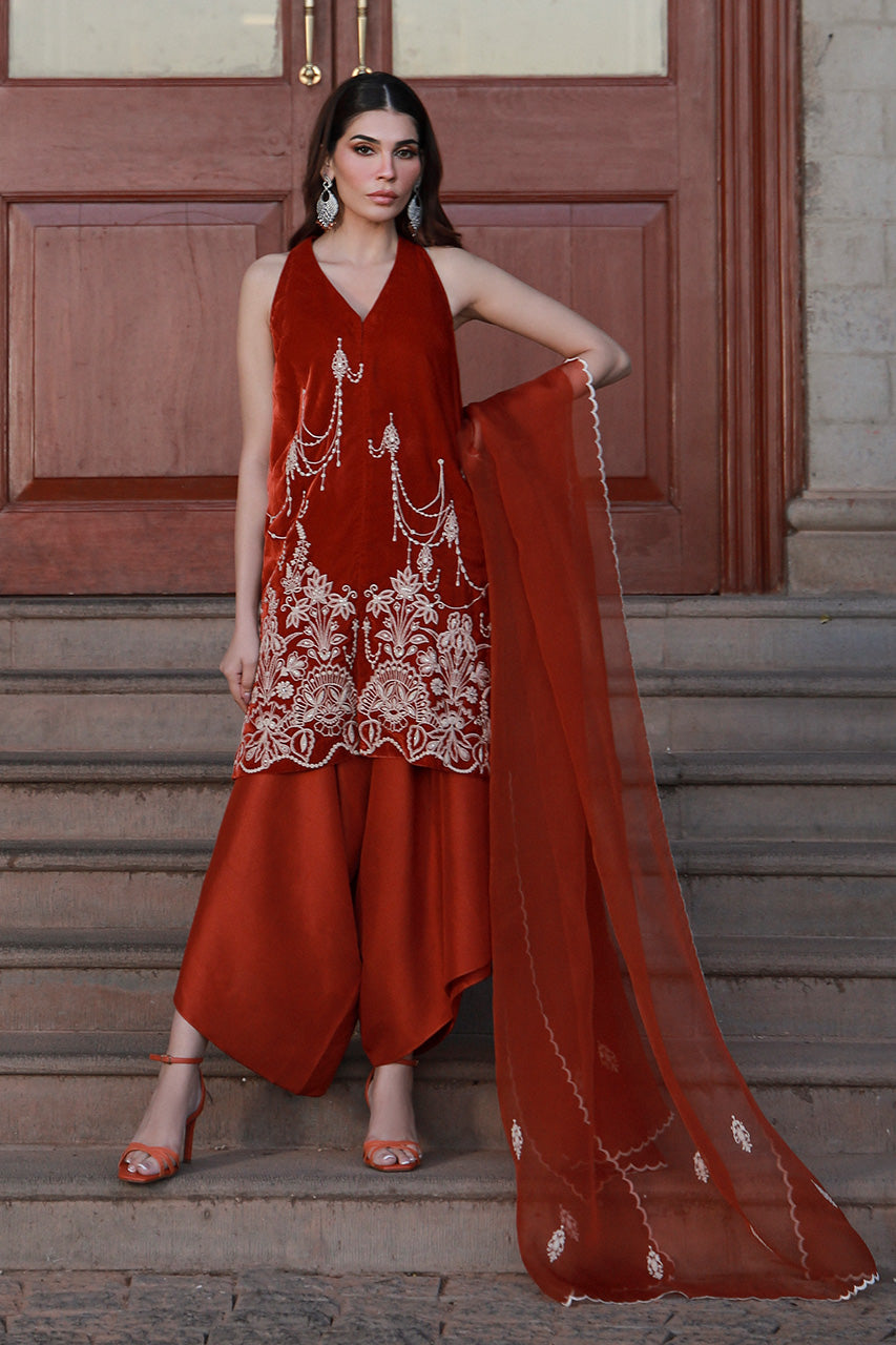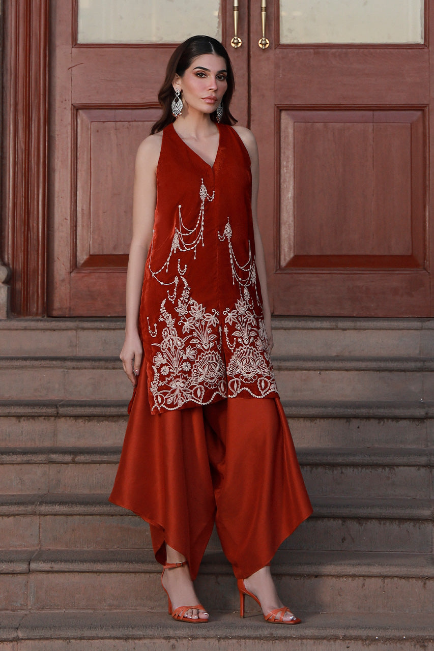 SHIRT: A rust, velvet shirt accentuated with embroidery on the front.