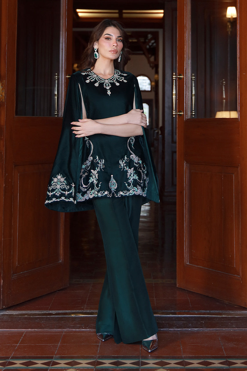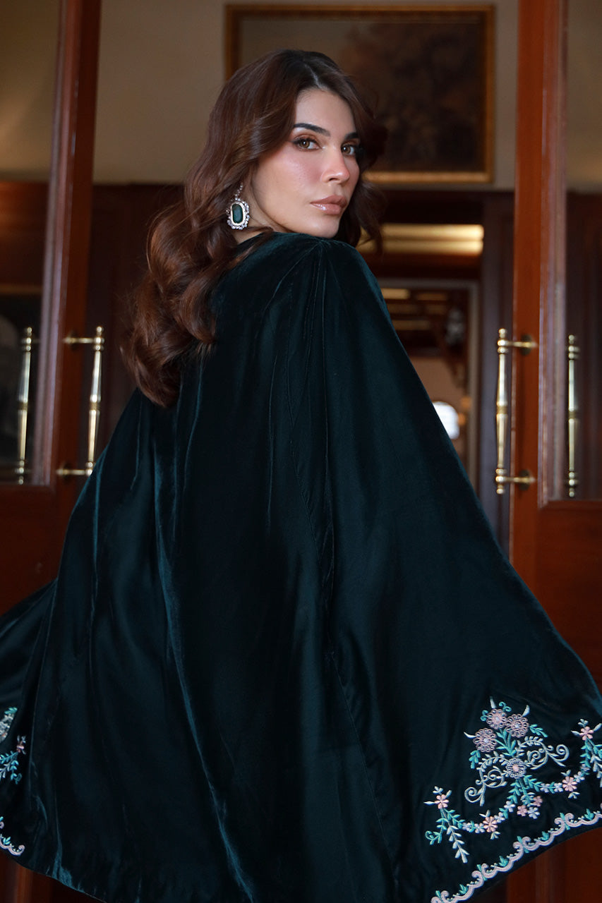 CAPE: An emerald green, velvet cape enhanced with embroidery and cutwork detailing.