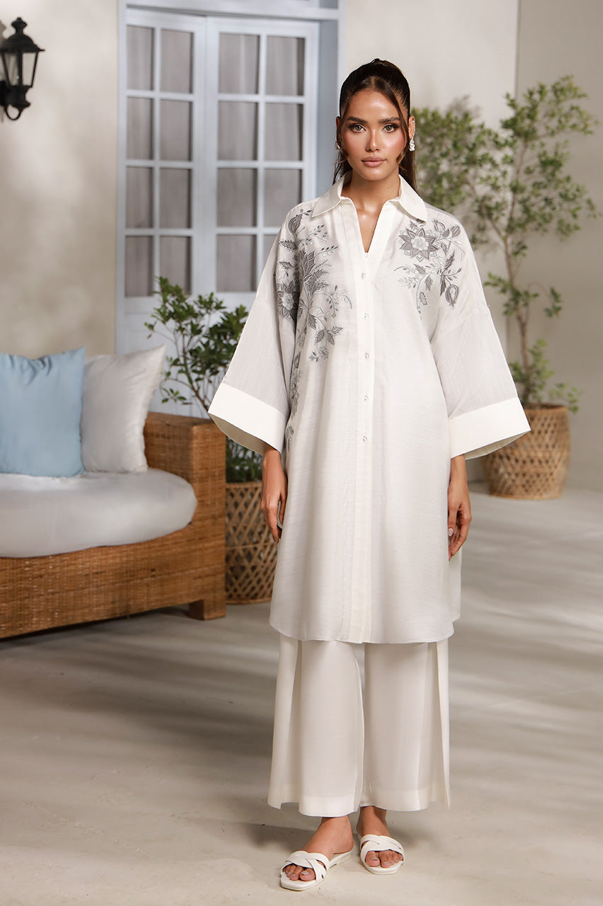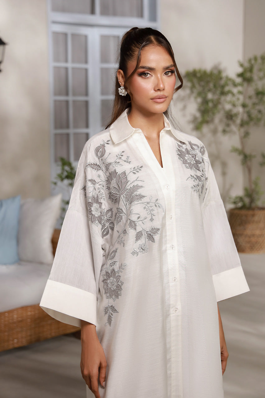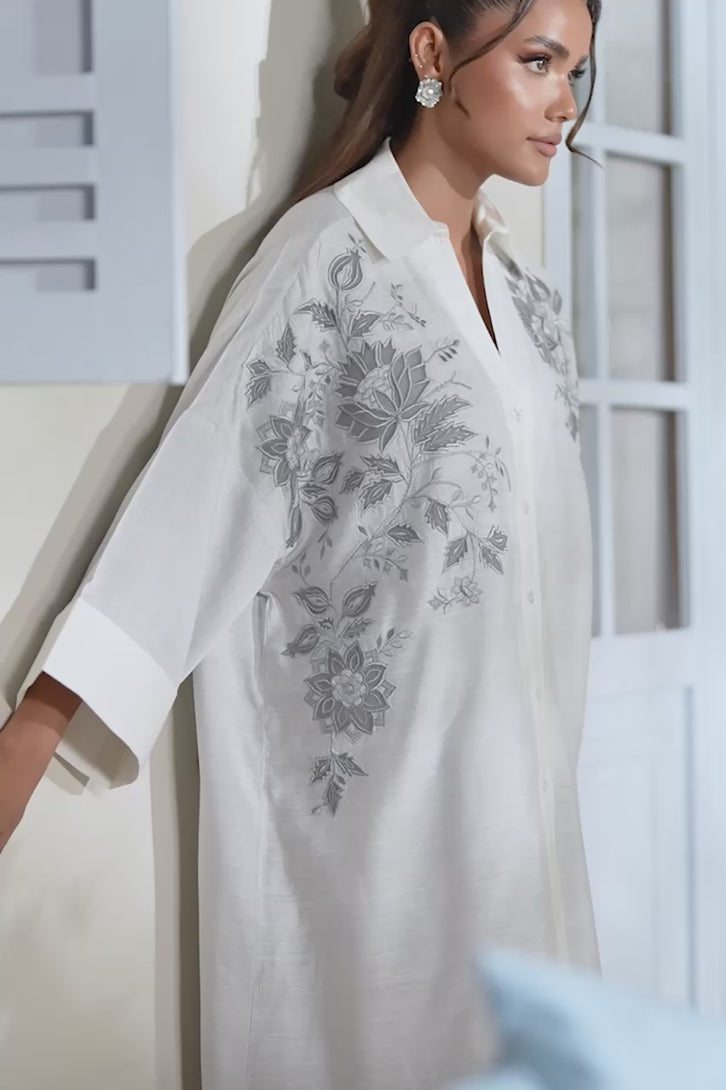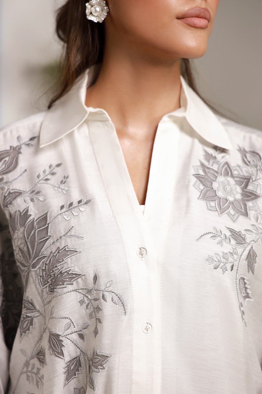 SHIRT: An ivory, premium cotton shirt enhanced with embroidery on the front.