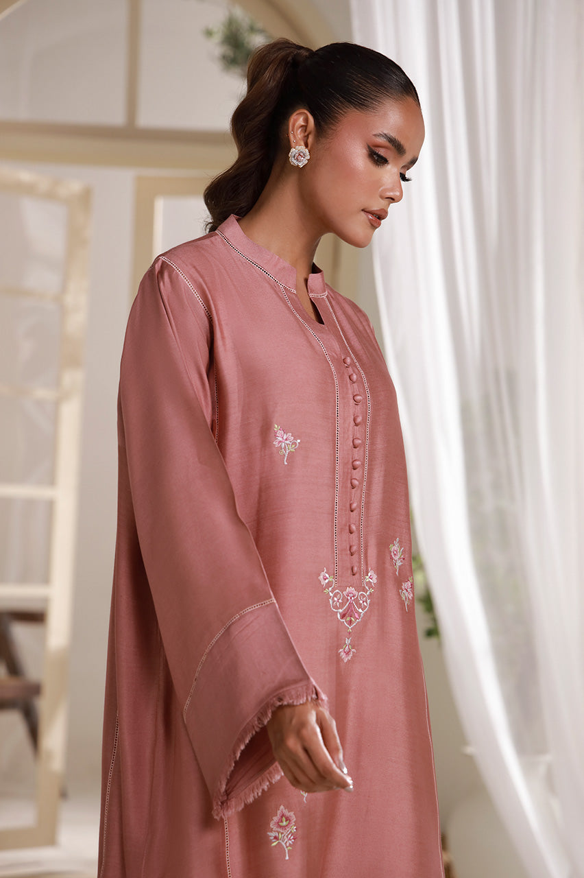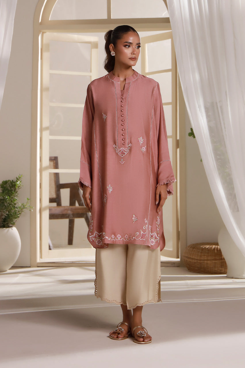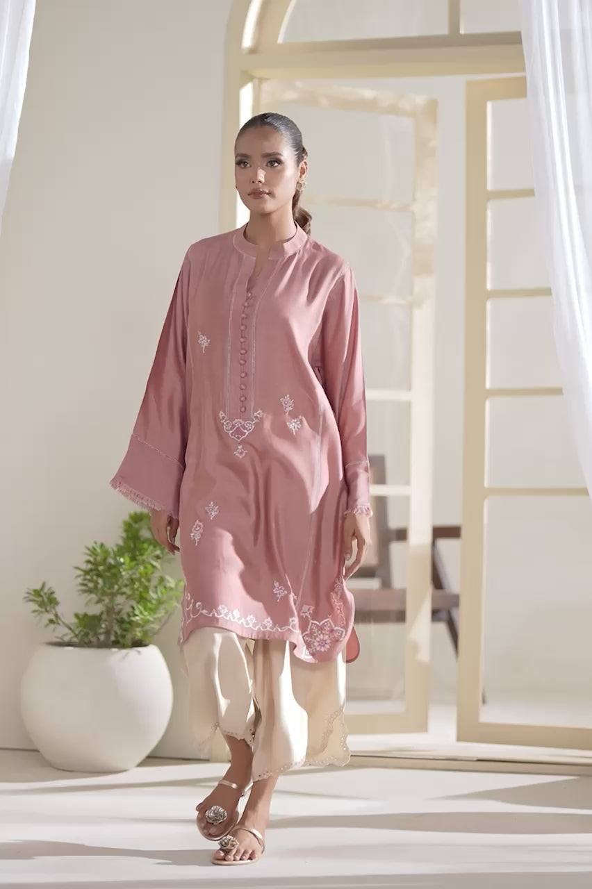 SHIRT: A dusty pink, premium cotton shirt crafted with embroidery on the front; made complete with fringe detailing.