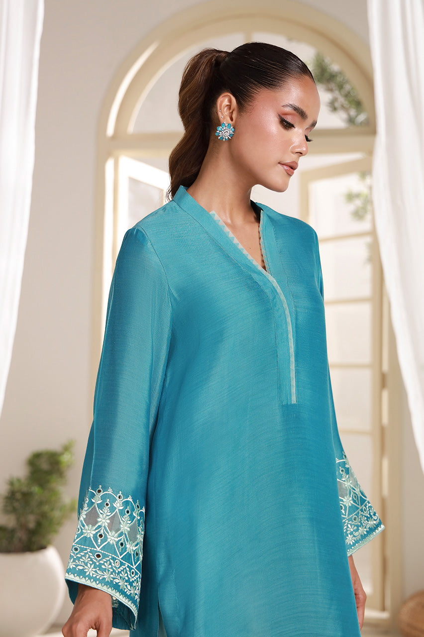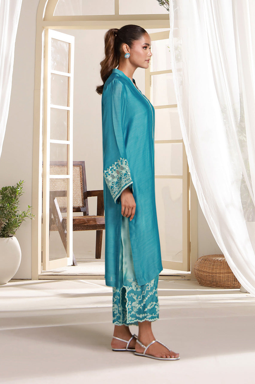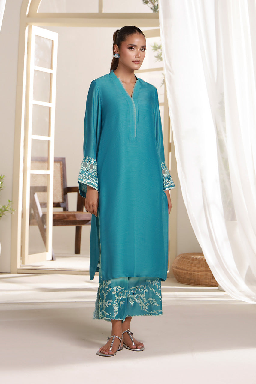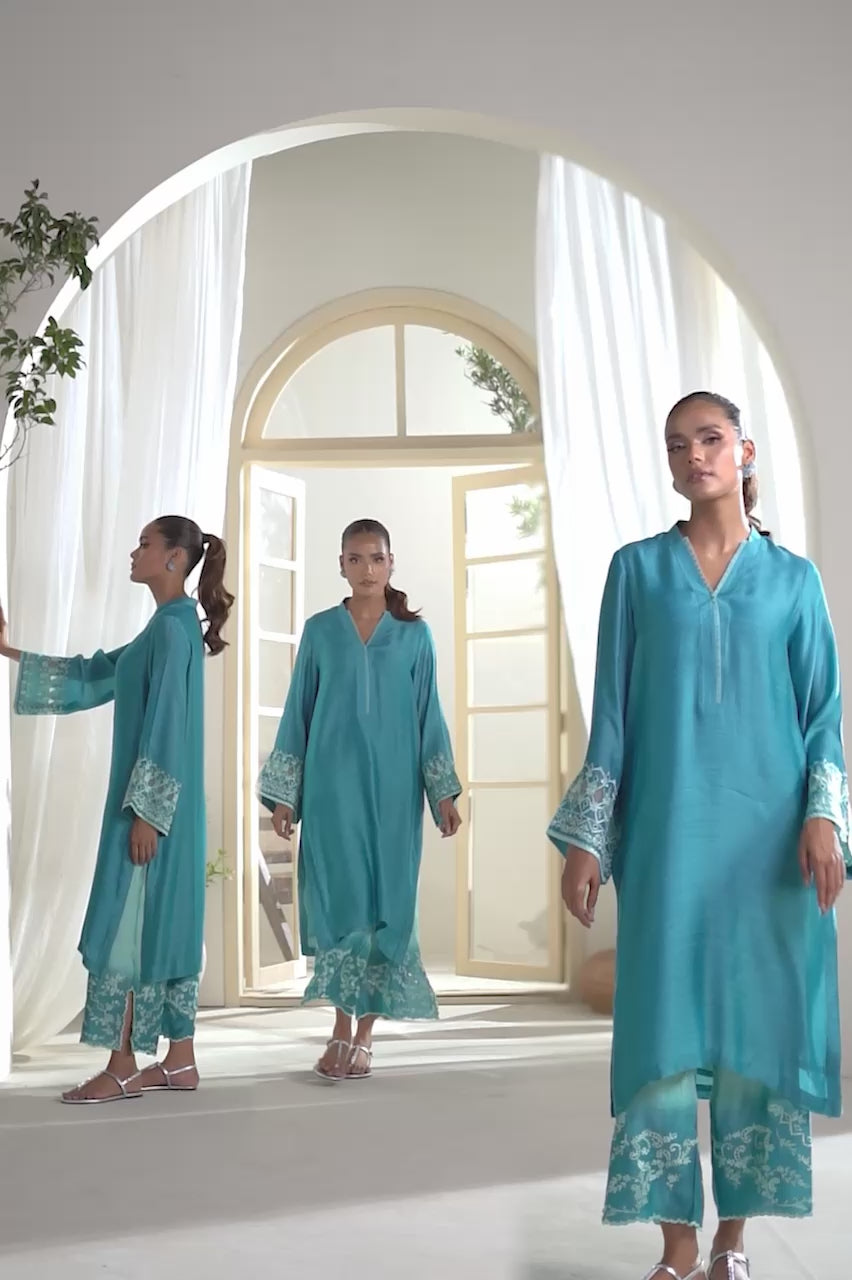 SHIRT: An aqua, premium cotton shirt elevated with embroidery on the front and sleeves; made complete with cutwork detailing.