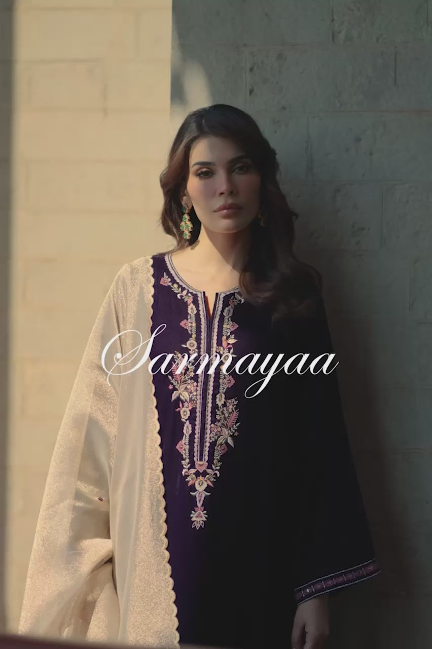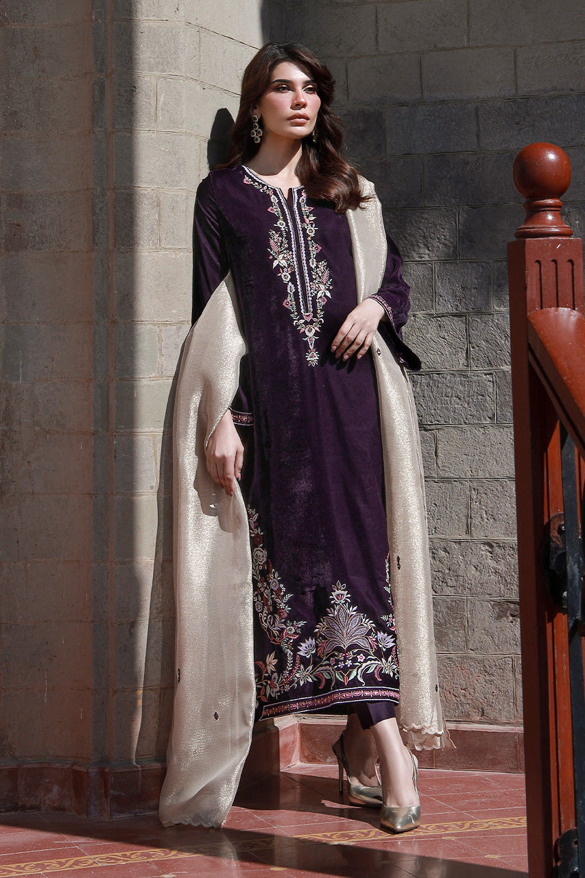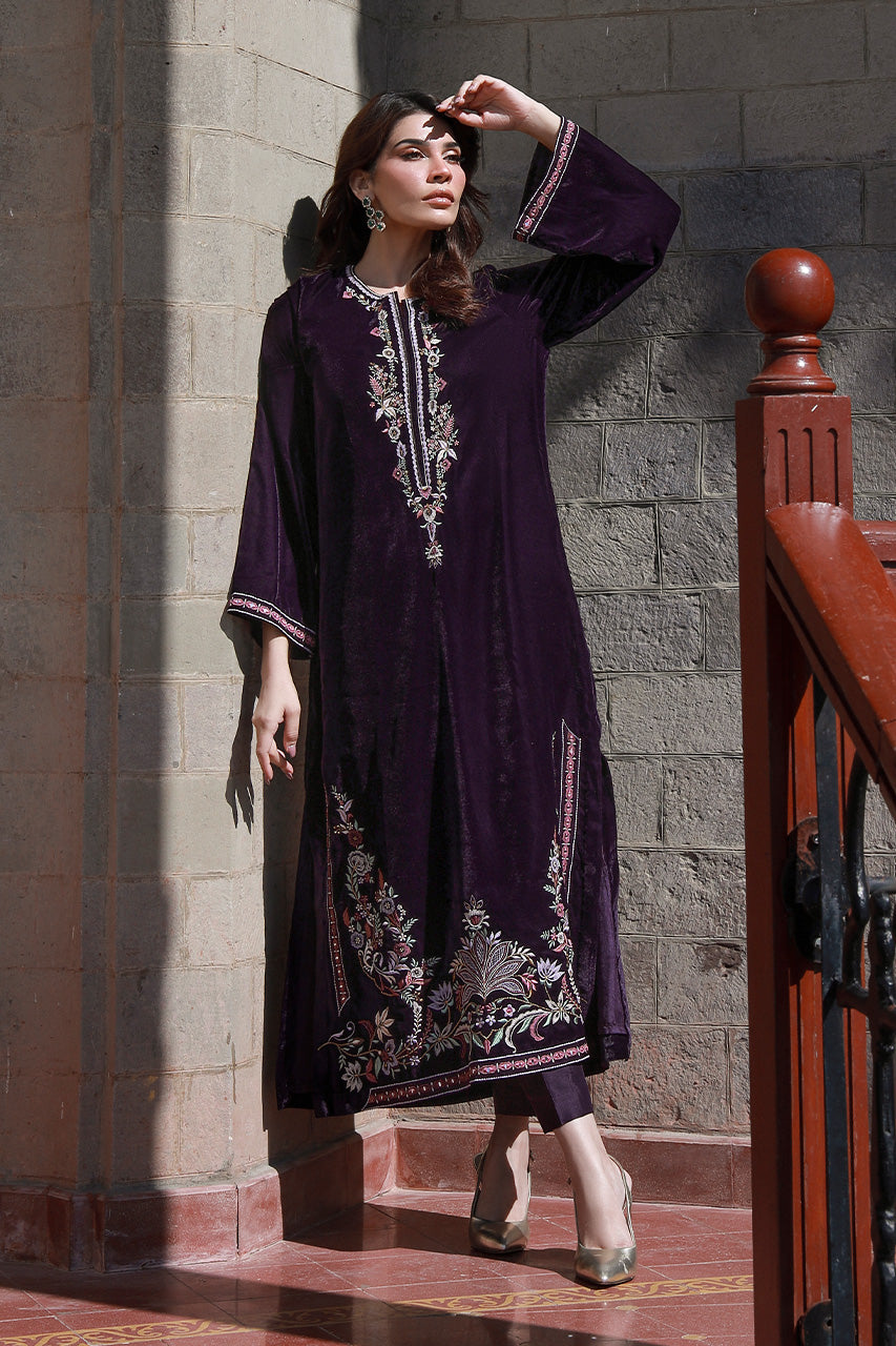 SHIRT: An aubergine, velvet shirt uplifted with embroidery on the front and sleeve cuffs.