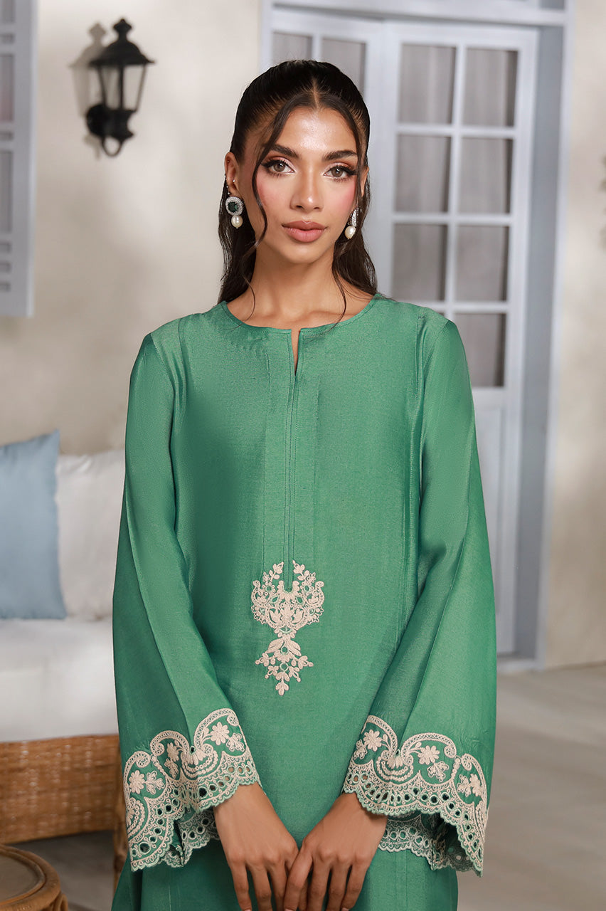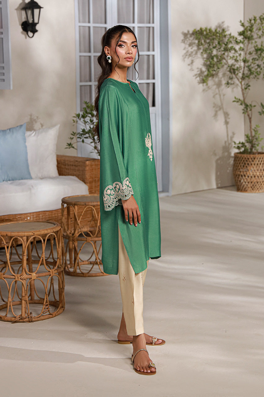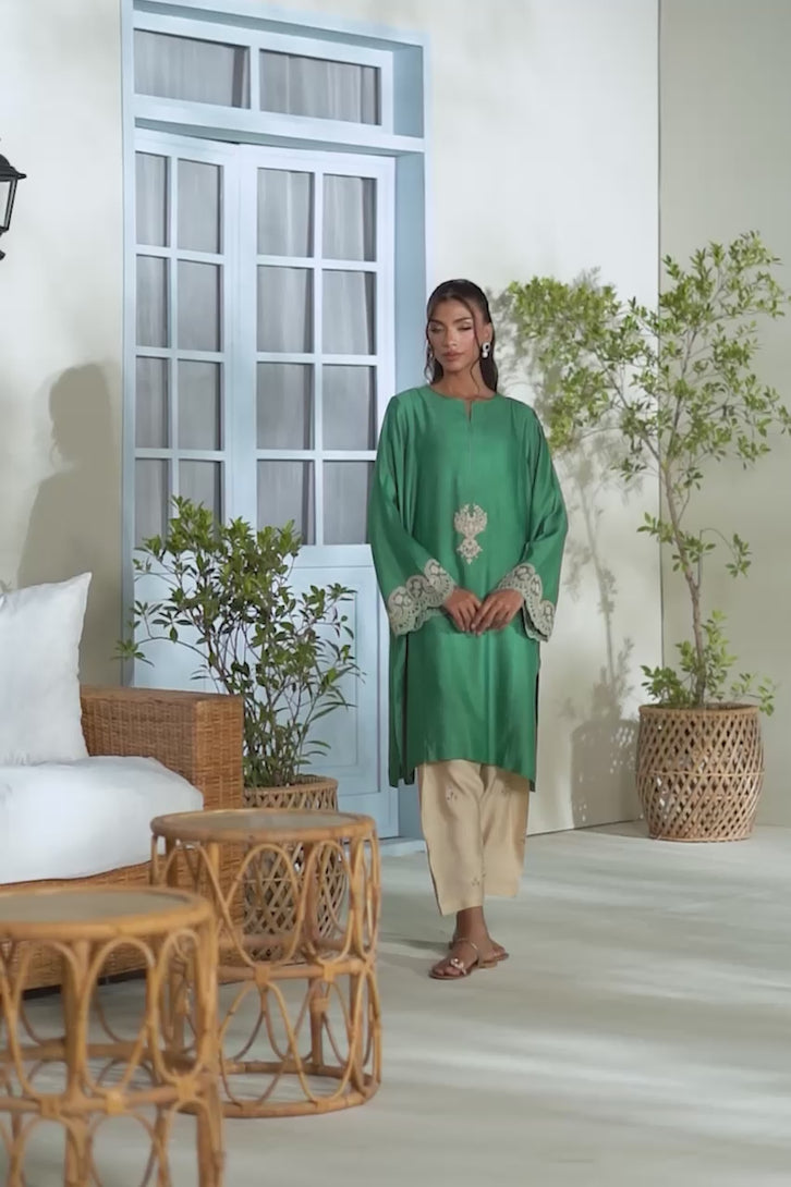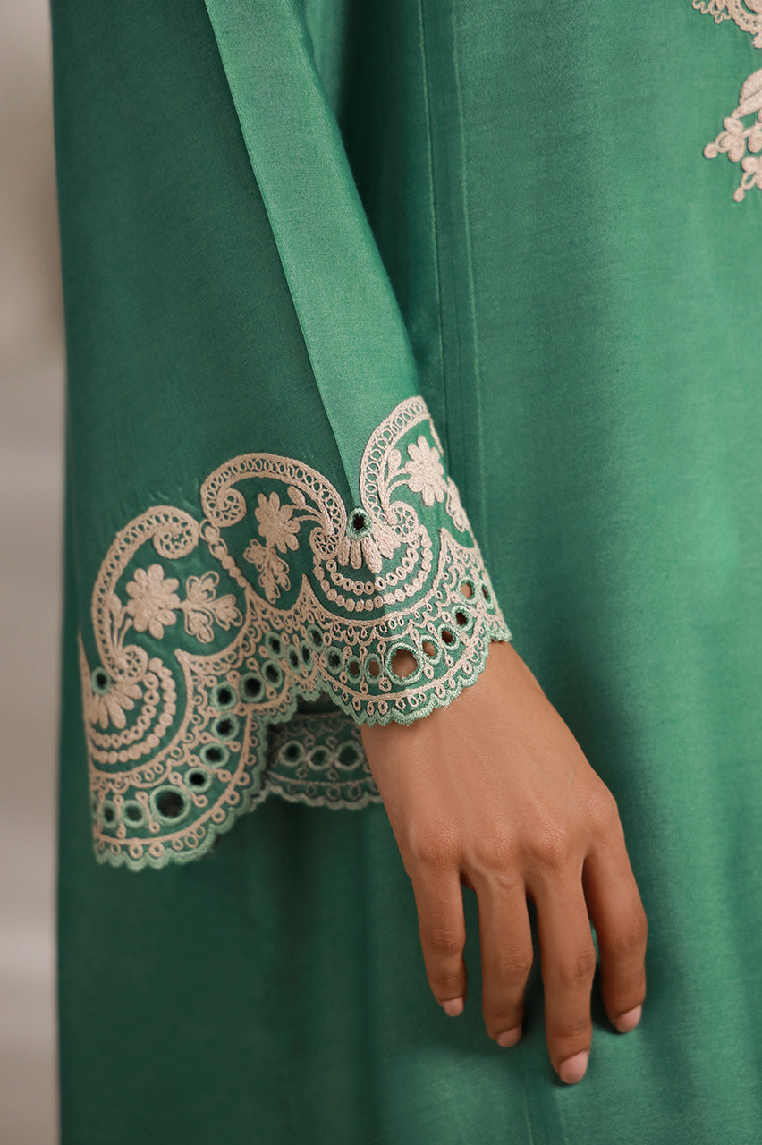 SHIRT: A moss green, premium cotton shirt uplifted with embroidery on the front and sleeves; made complete with cutwork detailing.